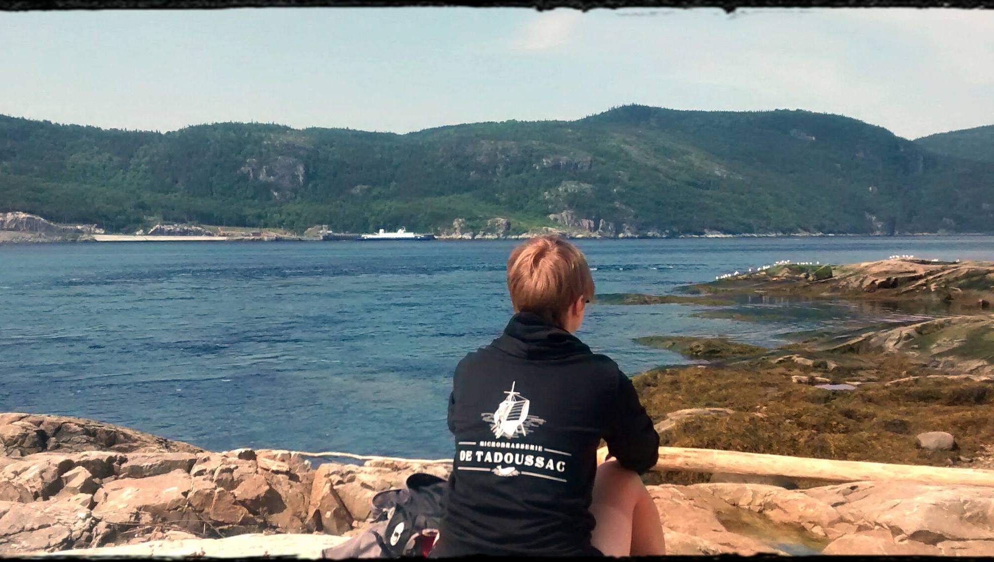 Prochain arrêt: Sacré-Coeur. À l’entrée du village, deux bonnes montées nous attendent. Épuisée et affamée (la nourriture est un enjeu important sur la route à vélo), je bénis l’épicerie à laquelle nous nous arrêtons. Après avoir englouti un sandwich et du chocolat (oui, encore du cacao), je repars avec Samuel pour le dernier tronçon avant Tadoussac. Les ultimes kilomètres à franchir deviennent de plus en plus ardus, car nous tournons en direction d’un gros vent de face.
