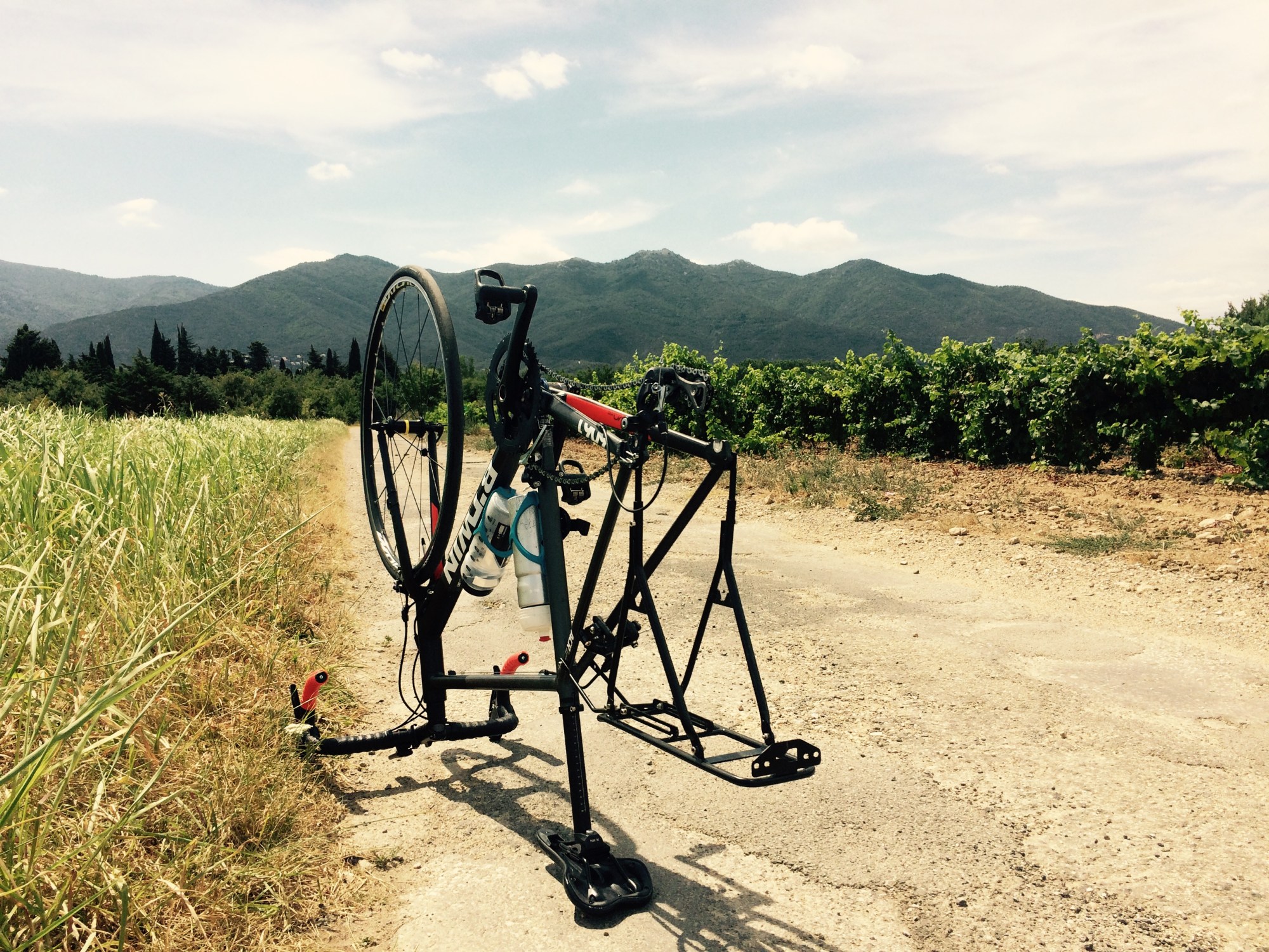 Je me retrouve donc sur une route nowhere. Je consulte mon cellulaire et il semble n’y avoir qu’un seul choix: rebrousser chemin et couper sur des routes perdues dans les montagnes. Je me dis que la signalisation ne peut pas m’abandonner comme ça… J’avance ainsi sur la desserte de l’autoroute. À mon grand soulagement, j’aperçois un autre cycliste. Je vais lui parler et il m’explique qu’il y a une piste cyclable qui se rend à Argelest-sur-mer. Tentant de suivre ses indications, je suis cette piste, mais ce n’est pas bien indiqué et je prends malencontreusement le mauvais embranchement. Conséquemment, je me retrouve sur une route maganée aux bordures de champs de vignes. Inévitablement, je fais un flat. Je commence à rager, mais bon, je me dis que c’est le premier depuis le début de cette aventure. Tout bon cycliste sait ça: quand tu fais un flat c’est toujours la roue arrière parce qu’elle est plus chiante à changer (surtout avec un porte-bagage). Je prends une petite gorgée d’eau et une banane (ma quatrième de la journée) et j’espère que mon équipement va me permettre de me rendre jusqu’au bout.