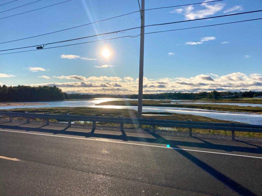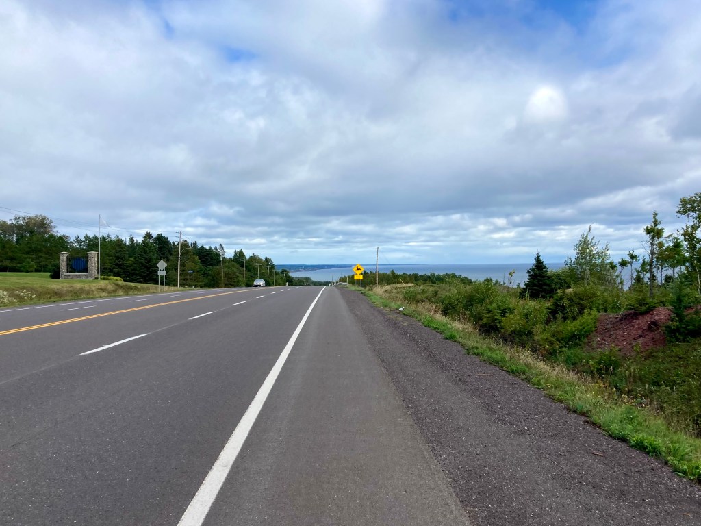 La difficulté matinale dure seulement 1h30 environ puisque je commence à voir les premiers rayons de soleil avec le petit croissant de lune qui flotte juste au-dessus. C’est vraiment particulier. À défaut de voir le rocher Percé, je profite des astres au-dessus de la mer. Le soleil d’automne me remotive. Bien que la pluie a cessé, je perds encore beaucoup de temps avec mes nombreux arrêts urine. Je crois que je m’hydrate par les pieds. Faudra que j’accepte de me geler les orteils et enlever mes couvre-chaussures pour faire sécher mes souliers avant de changer de bas. Pour l’instant ce n’est pas une option vue que le pavage est encore mouillé.