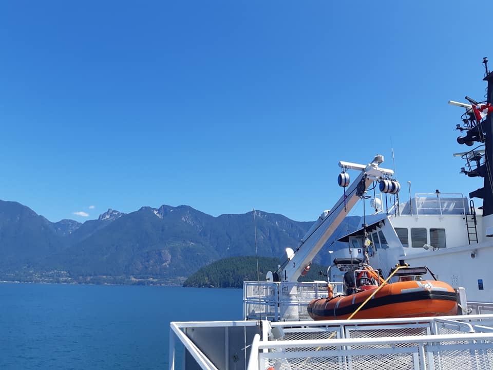 Puis, sous la chaleur montante du soleil qui passe au zenith, nous avons ralenti le tempo. C’est sans problème que nous sommes arrivés à temps pour le traversier de 15h30 vers Powell River. Encore une fois, la traversée nous a offert une vue magnifique sur les montagnes de l’île de Vancouver et les petites îles de la Colombie-Britannique. J’aime bien ces pauses maritimes dans une journée de vélo.