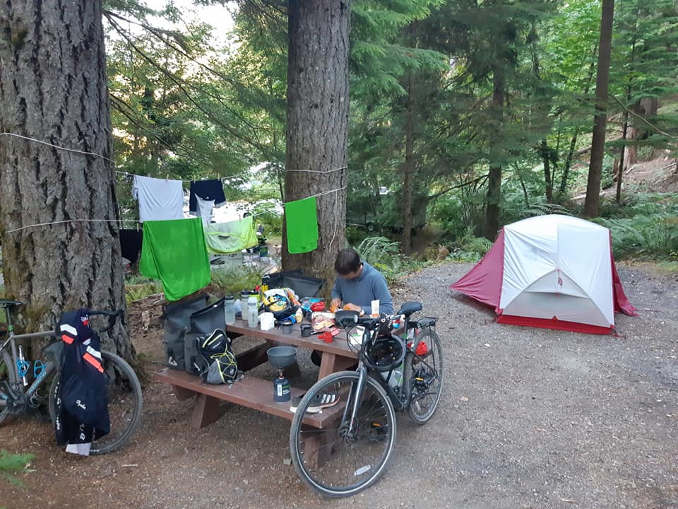 Hier soir nous avons croisé un trio de cyclistes qui arrivaient tardivement et exténués d’une grosse journée de vélo. Tout comme Samuel et moi, ils voyagent en mode cyclocamping, ils font à peu près la même boucle que nous, et ils sont également partis de Vancouver. J’étais très excitée d’échanger avec des pairs, jusqu’à ce que je fasse le calcul qu’ils ont roulé en deux jours ce que nous avons parcouru en cinq jours. C’est niaiseux, je le sais, mais je me suis soudainement sentie comme une patate lâche. J’ai même senti le besoin de justifier notre rythme lent, en soulignant qu’on était surtout en vacances. Pourtant, je croyais avoir assumé ce choix, celui d’opter pour de courtes distances, lorsque j’ai tracé notre trajet, justement pour ne pas être à la course entre chaque destination, pour apprécier pleinement notre environnement, me reposer et avoir du temps de qualité avec mon amoureux. Il faut croire que malgré tout, j’ai ressenti un complexe d’infériorité face à ces étrangers. Quand j’y repense, je vais essayer de garder en tête que la question à me poser lorsque je planifie mes voyages ne devrait pas être: qu’est-ce que je suis capable de faire? Mais plutôt: de quoi j’ai besoin en ce moment dans ma vie?