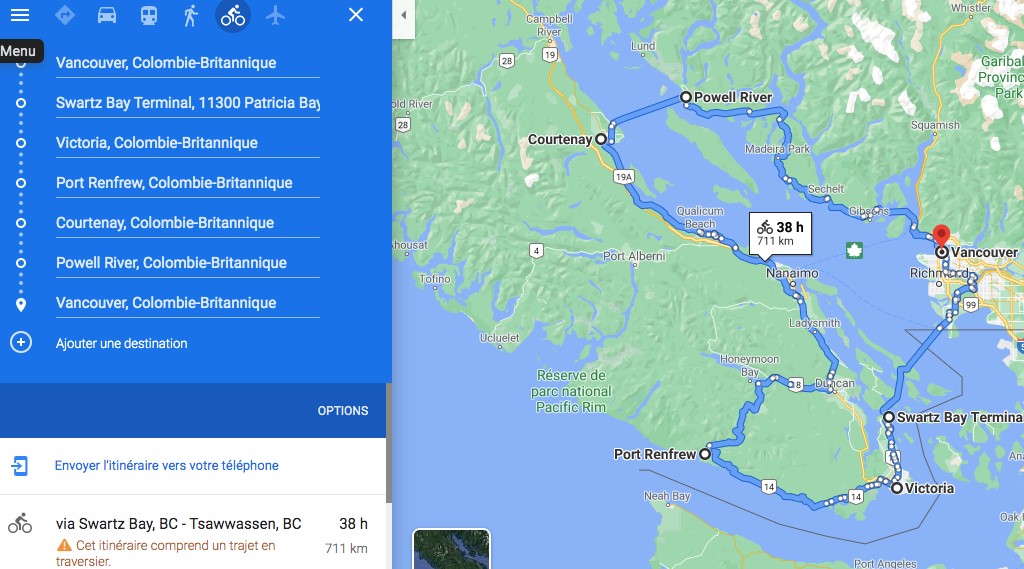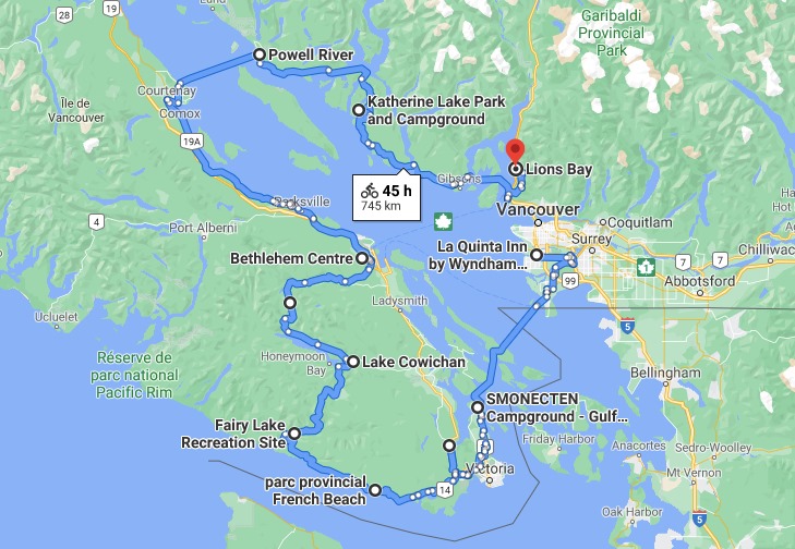 En terminant en chiffres, pour avoir une idée de notre trajet, il y a googlemap! J’étais rendue au maximum de destinations sur la carte, il manque donc notre virée à Salt Spring Island et le dernier bout entre Lions’Bay et Richmond, ainsi que la montée terrible de + de 500m de D+ sur 9km à Salt Spring Island.