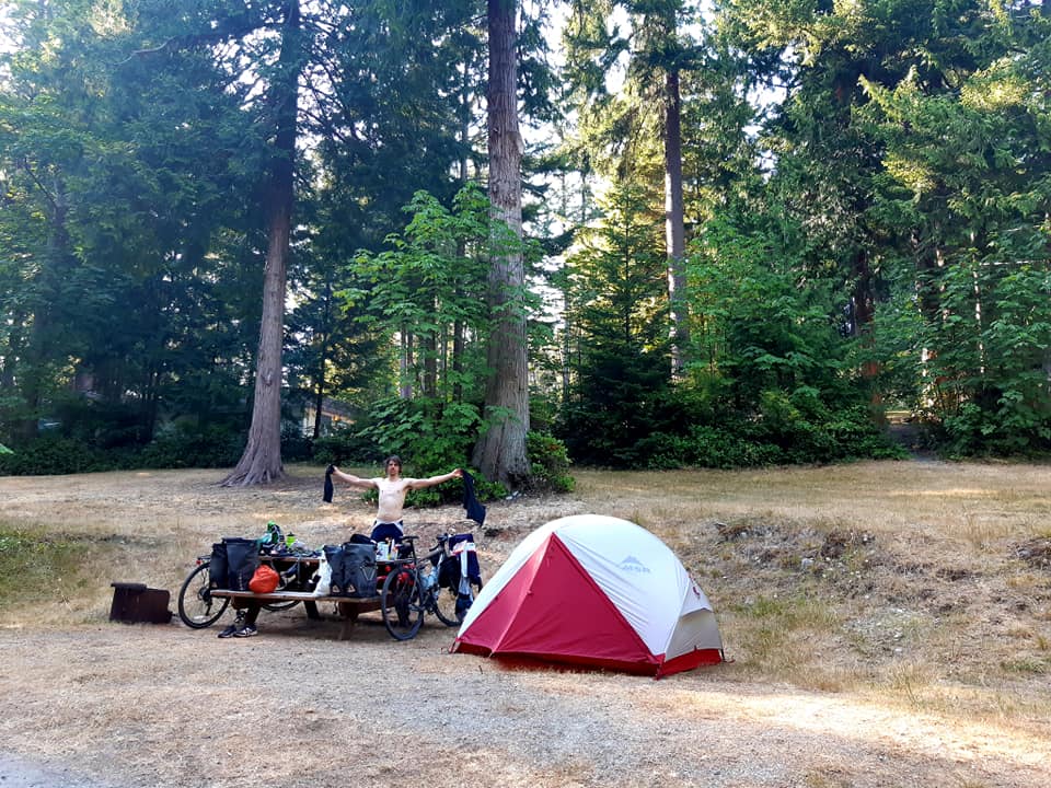Nous sommes arrivés au camping un peu avant 14h00, ce qui nous a permis de profiter des installations naturelles. Le parc Englishman River Falls offre une belle petite randonnée très familiale de 4-5 km – ce qui est parfait pour nos jambes fatiguées – à travers une forêt verte et une jolie chute, au pied de laquelle nous nous sommes à la fois baignés et lavés. Selon mon expérience des derniers jours, les BC parks n’offrent jamais de douche. On aimerait parfois avoir accès à un seau ou à un lavabo pour laver nos vêtements, mais ça va. On réajuste nos critères d’hygiène. Au moins, le climat n’a pas été trop froid ou trop humide, ce qui donne le temps à nos vêtements de sécher l’après-midi et la nuit, et d’être secs lorsqu’on les range dans nos sacoches de vélo le lendemain. Ce qui ne fut pas toujours le cas lors de notre périple à travers les Laurentides, l’Outaouais et Lanaudière.