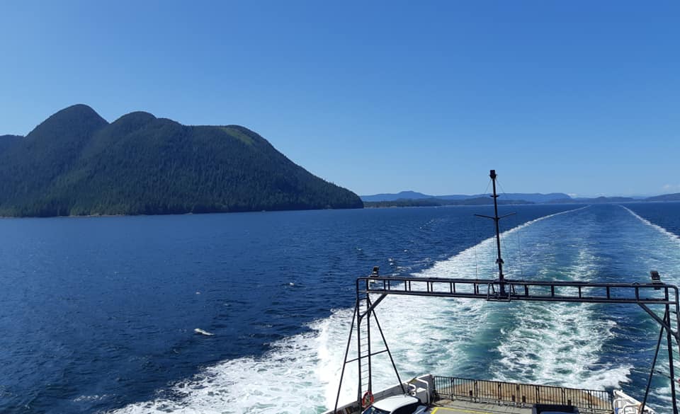 Le ferry entre Saltery Bay et Earls Grove – notre cinquième à date – nous a offert une ride féérique ! J’en avais la mâchoire à terre d’émerveillement! On se croirait dans l’univers de Jurassic Park! Et ce n’est pas parce que je n’ai rien vu dans ma vie, j’en ai mangé des paysages à travers le monde, mais je dois dire que la côte ouest de la Colombie Britannique n’a rien à envier.