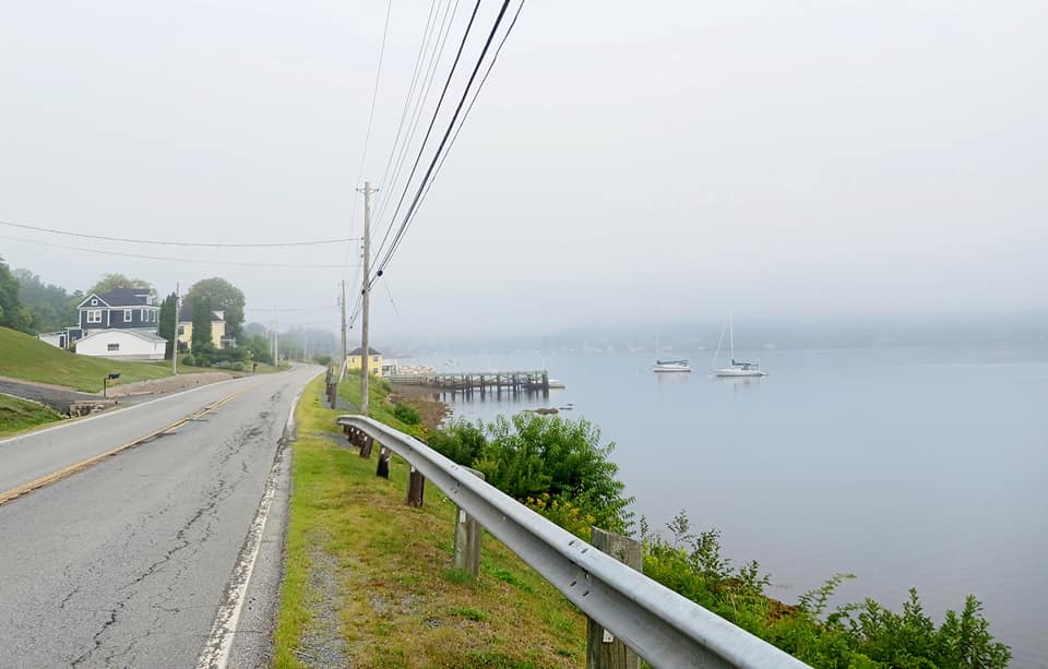 Disons que j’ai vécu une montagne russe d’émotions, passant d’un sentiment de douceur intérieur pendant que je longeais la jolie baie de Mahome dans la brume matinale, à de la colère noire après m’être trompé de chemins deux fois et avoir dû remonter des méchantes côtes qui arrachent!, à du découragement dans un chemin de côtes et de garnotte, à de la honte quand j’ai marché à côté de mon vélo sur 100 mètres parce que j’en arrachais trop, puis à du soulagement quand j’ai retrouvé la grande route 14, et enfin, à du Oh shit! Face à toutes les côtes qui m’attendaient sur celle-ci. J’ai adoré les dix derniers kilomètres avant Windsor, où le dénivelé était plat et le paysage composé de fermes et de vallons verts.