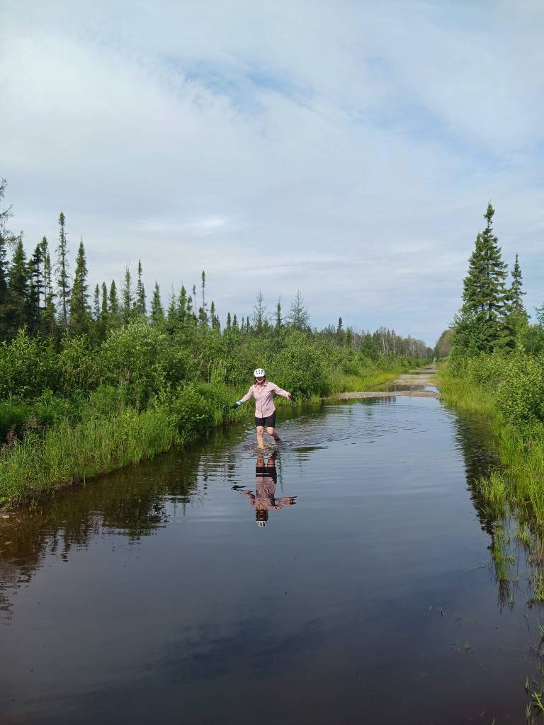 Ça commencé à se corser quelques kilomètres plus loin, en tournant vers le chemin de gravier des rangs 4e et 5e E. Nous roulions depuis à peine dix minutes lorsque nous sommes tombées face à une première grosse flaque d’eau. Je devine qu’il avait dû pleuvoir les jours précédents et que les marais ont débordé dans les rangs. Conséquemment, nous avons dû faire des portages pour traverser les étendues d’eau dont la profondeur nous enfonçait parfois jusqu’à la hauteur mi-cuisse! Souvent, c’est Céline qui partait à l’avant vérifier la consistance du sol sous les eaux boueuses et la hauteur de celles-ci. Si j’avais été seule, j’aurais probablement fait marche arrière pour reprendre la route asphaltée, mais avec Céline, nous avons choisi le risque et l’aventure!