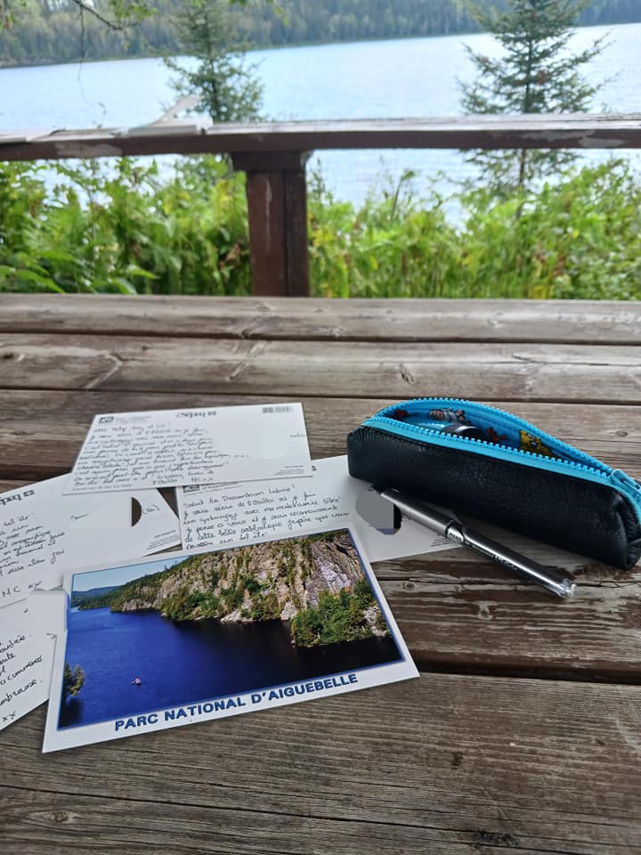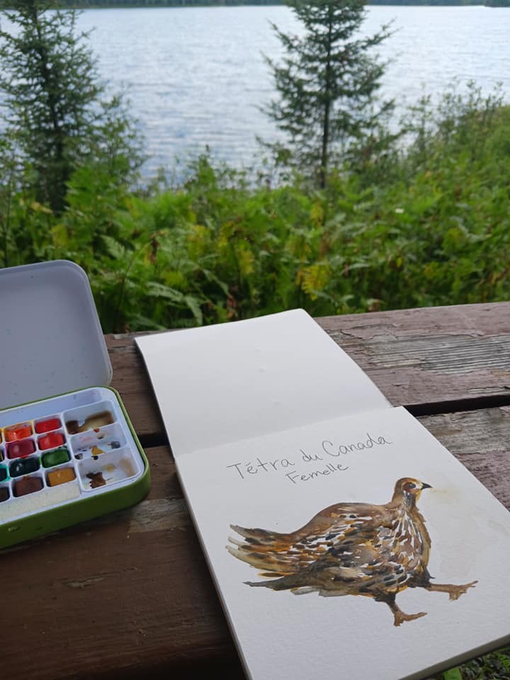 Il n’y a pas que le vélo dans la vie! Nous avons profité de notre journée de repos au parc pour se baigner, faire du canot, lire, et pour ma part, écrire des cartes postales à mes proches. De son côté, inspirée par tous les animaux sauvages rencontrés dans les derniers jours, Céline a sorti son pinceau pour faire des aquarelles.
