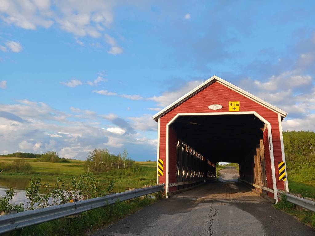 Somme toute, le trajet s’est bien passé même si j’étais fatiguée de ma courte nuit. Il y avait pas mal de maringouins sur notre terrain – une première depuis le début de notre voyage – et nos voisins de roulotte ont veillé tard. Au moins on a pu déjeuner en paix des moustiques et des couche-tards. J’ai donc pédalé avec le regard fixé sur l’asphalte.
