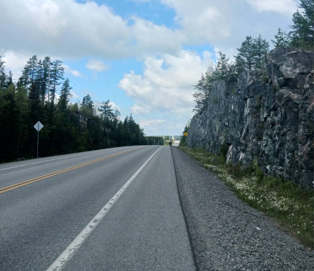 Depuis quelques jours, nous appréhendions le moment où nous devions prendre la route 117, surnommée la Sang 17, en raison du nombre d’accidents meurtriers. La portion entre Rouyn-Noranda et Malartic est très utilisée par les travailleurs et travailleuses des mines. On dit qu’ils sont souvent pressés et que leur conduite est parfois forte en Red Bull. En fin de compte, ça super bien été! Il y a du trafic mais l’accotement est large et les gros camionneurs – ceux qui chauffent des gros camions – sont la plupart du temps très sympathiques aux cyclistes. Fait à noter: il n’y a aucun point de ravitaillements et très peu d’ombre sur les cinquante kilomètres entre Rouyn et le Lac Normand. Les côtes et le soleil cuisant de midi ont été un défi, mais vu la courte distance, ce fut supportable.