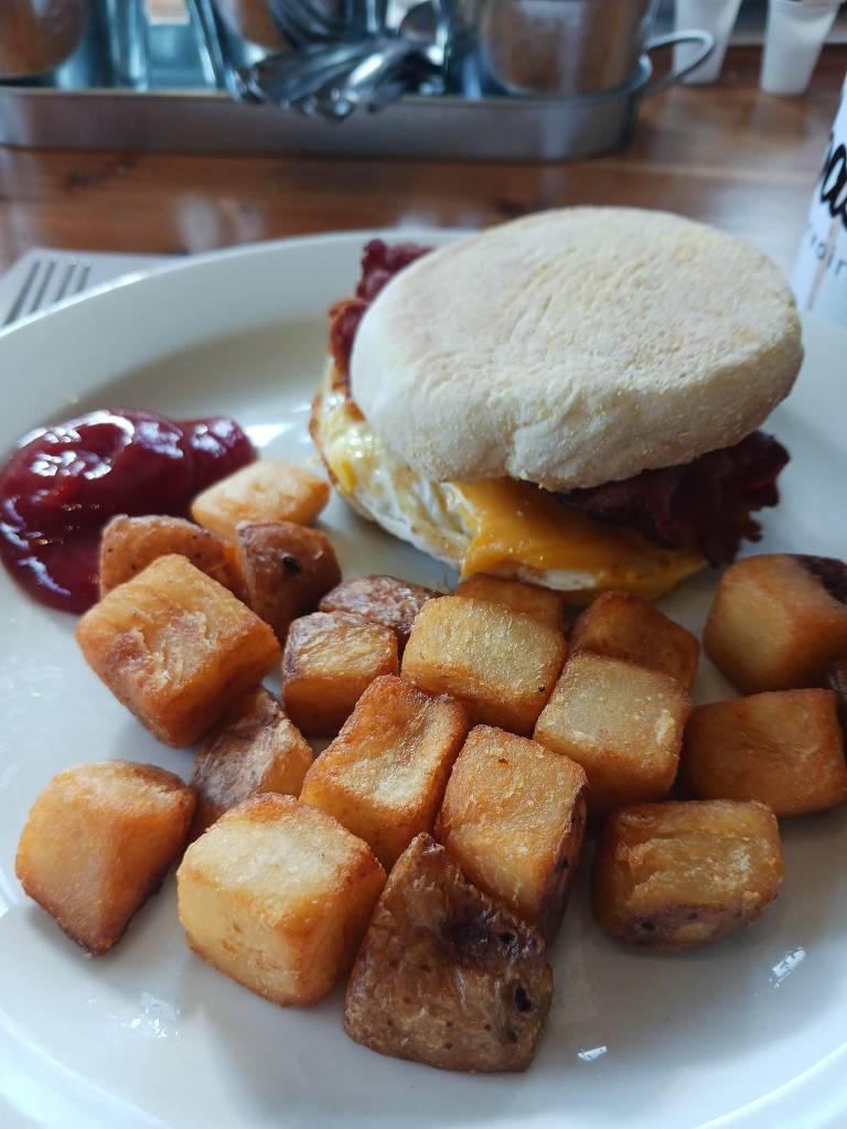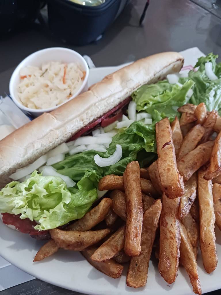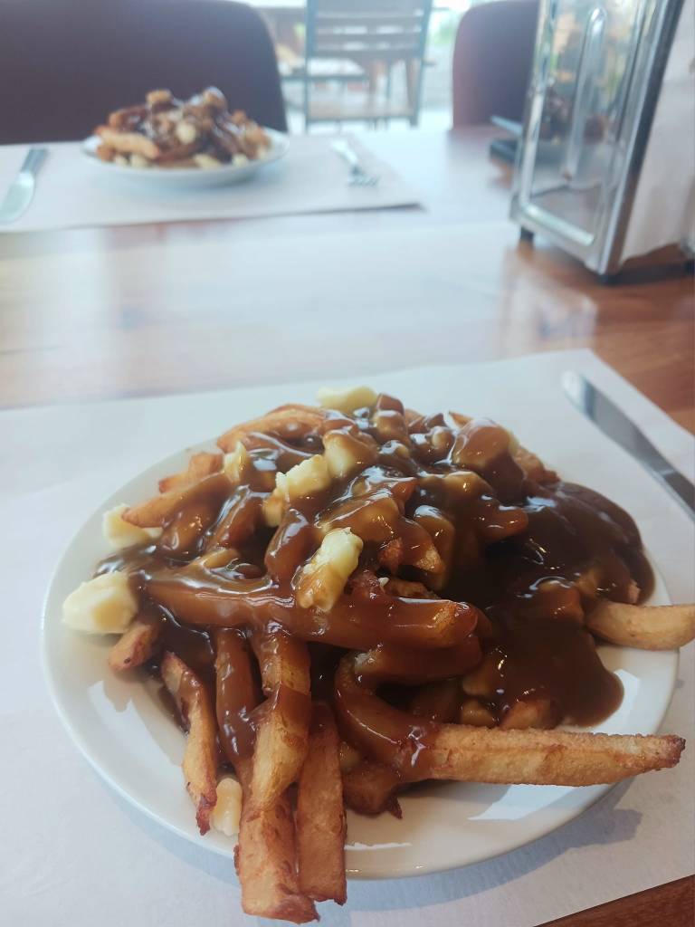 Le Huard n’offre pas de service de dépanneur ni de cafétéria, mais la pourvoirie Obaska qui est situé à trois minutes de vélo de là, propose un menu pour le déjeuner et de la poutine jusqu’à 14h. Nous sommes arrivées juste à temps pour le last-call poutine de l’après-midi! L’une des campeuses de la pourvoirie nous a elle aussi reconnues après avoir vu passer sur Facebook notre appel sur « Viens piquer ta tente chez-nous » ! C’est fascinant!