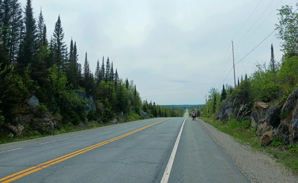 L’une de nos belles surprises de la journée fut de recroiser Bertrand, le cycliste que nous avions rencontré la veille sur le haut d’une butte dans le chemin 4 saisons à Malartic. Cette fois, son épouse était venu le déposer sur le bord de la 117, son point de départ pour faire du pouce avec tout son matériel de vélo. Son objectif? Décoller sur ses deux roues de Grand Remous pour rouler jusqu’à Québec. Nous nous sommes arrêtées pour le saluer, échanger quelques mots et prendre une photo. Dix minutes plus tard, il nous dépassait dans un pick-up blanc!
