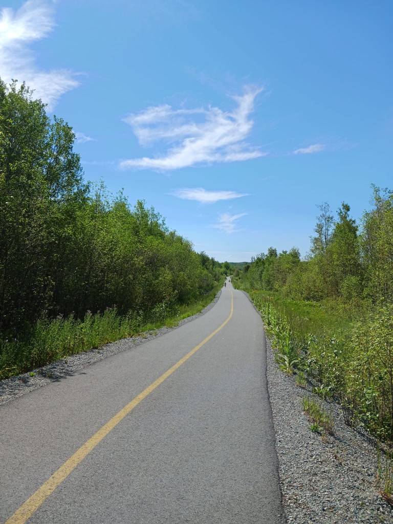 Les vingt premiers kilomètres nous ont ramenées sur la 117, or le gros fun a vraiment commencé sur le chemin Malartic puis sur la piste cyclable 4 saisons en gravier! Yahouuuu! C’est sans contredit l’un des plus beaux tronçons de notre voyage, une vraie petite perle cyclable bien aménagée. Nous y avons croisé seulement une coureuse et un cycliste, prénommé Bertrand. Nous avons échangé quelques mots avec celui-ci sur notre cyclovoyage. Il voyait bien qu’avec notre bagage nous n’étions pas là juste pour une petite sortie de vélo-maison.