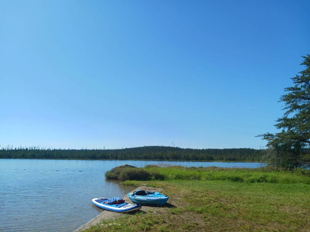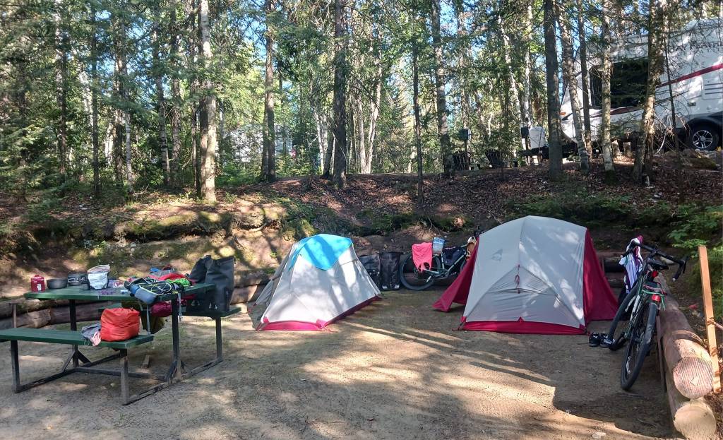 Le camping du Lac Beauchamp est un endroit très familial et reconnu en Abitibi. Nous sommes les seules tentes dans un village de VR, mais notre spot est joli et à l’ombre. Le lac est magnifique! L’eau est fraîche, propre et translucide. Plusieurs la trouvent froide, mais pour deux filles des îles, la température est parfaite, surtout après une chaude journée de vélo!